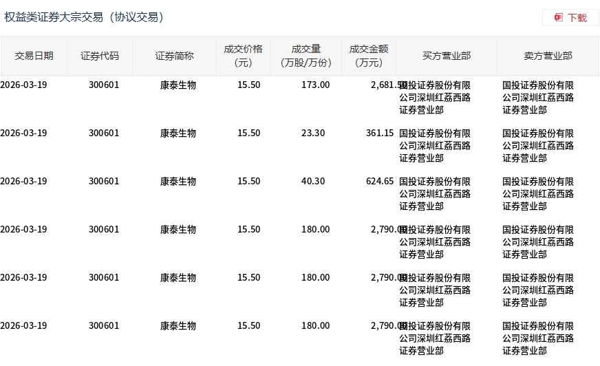 3月19日,康泰生物大宗交易成交776.6万股,成交额1.2亿元,占当日总成交额的40.41%,成交价15.5元,较市场收盘价14.17元溢价9.39%。